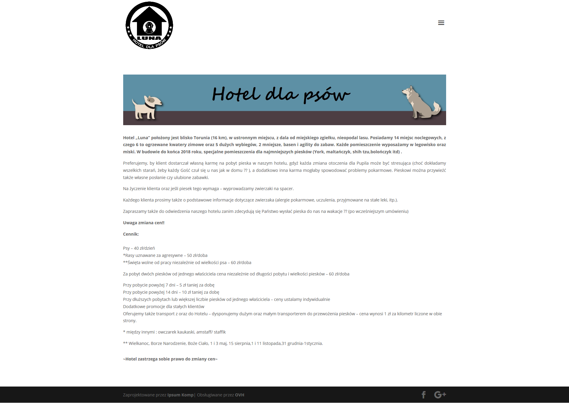 Kategoria hotel dla psów / hodowla – Hotel Luna. Sympatyczne miejsce położone 16 km od Torunia, z dala od miejskiego zgiełku, nieopodal lasu. Placówka posiada 14 miejsc noclegowych, z czego 6 to ogrzewane kwatery zimowe, oraz 5 dużych wybiegów, 2 mniejsze, basen i agility do zabaw. Każde pomieszczenie wyposażone jest w legowisko oraz miski. Do tego specjalne pomieszczenia dla najmniejszych piesków (York, maltańczyk, shih tzu,bolończyk itd). Strona mieści się pod adresem: https://hotel-luna.pl