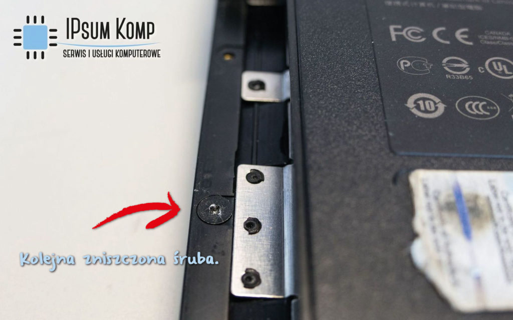 Po dokonaniu oględzin zewnętrznych dostrzegliśmy, że brakuje jednej śruby. Pozostałe noszą znaczne ślady demontażu przy użyciu nieodpowiednich narzędzi.